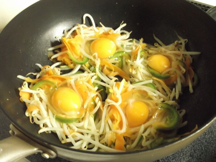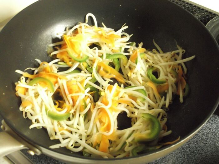 ピーラーで薄く切った人参・縦細切りのピーマン・もやしを