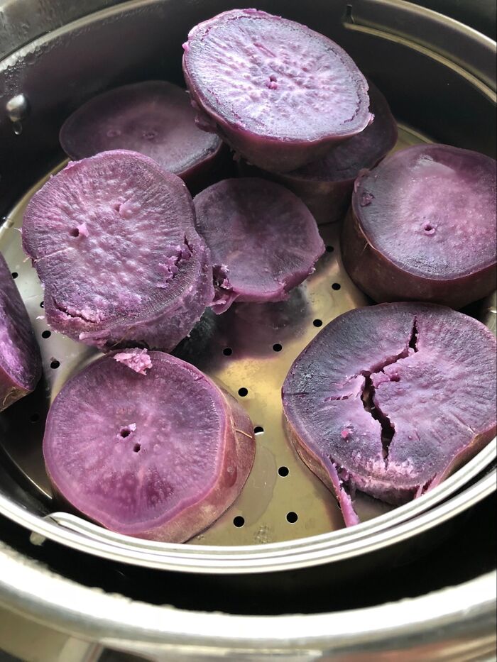 紫いもは蒸して、マッシャーでつぶしておく。