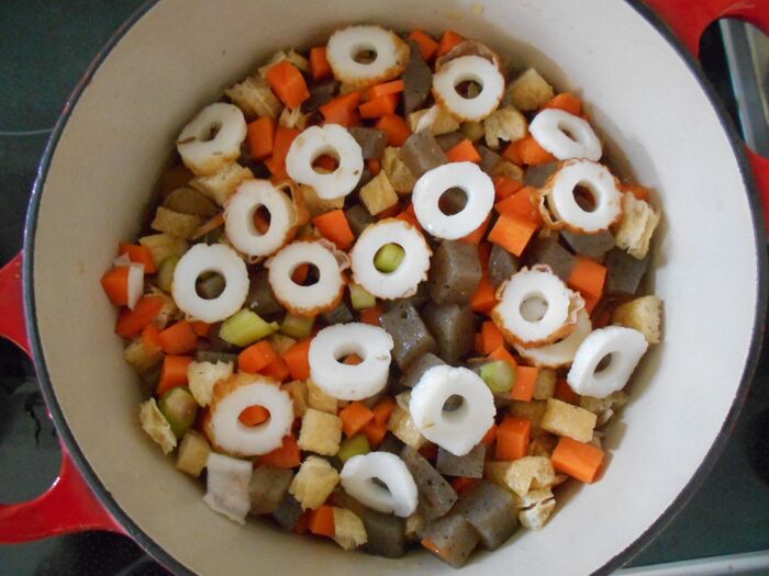 ・コンニャクは塩でもんでさっと熱湯にくぐらせ、3~5角切に切る。