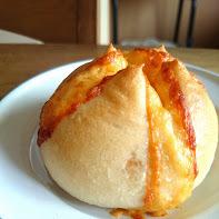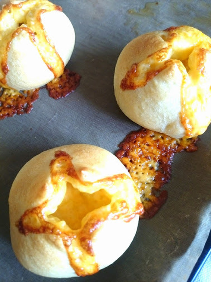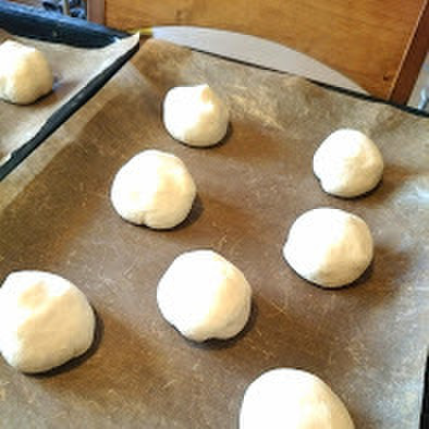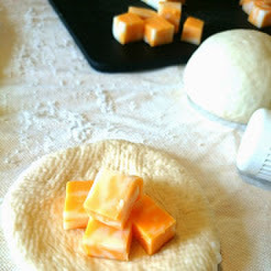 一時発酵後、生地を1つ50グラムに丸め15分べンチタイム→ひっくり返し、手で押さえ、ガス抜きをし、麺棒で軽くのばす。チーズをのせ、包む。