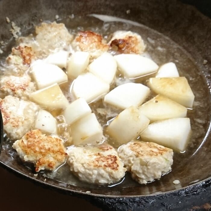 鶏団子を焼く前から、分厚く切りいちょう切りした大根を煮ています。