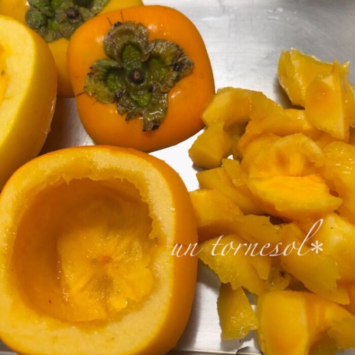 柿はヘタから約1cmぐらいのところを切り落とし、スプーンで実をくり抜き、くり抜いた実は約1cm角ぐらいに切っておく。