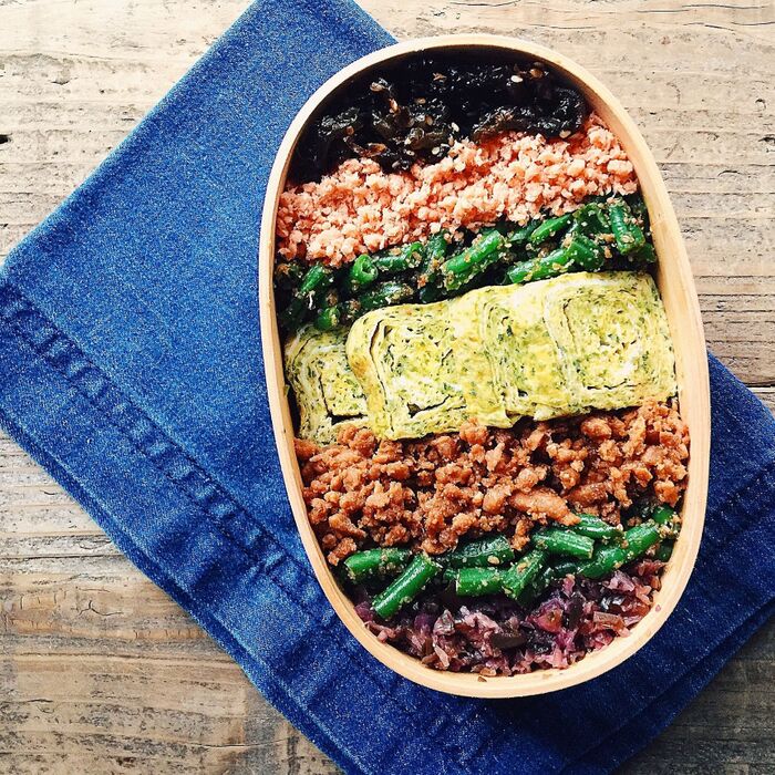 鶏そぼろ、鮭フレーク、いんげんごま和え、ひじきの梅煮、しば漬け。
