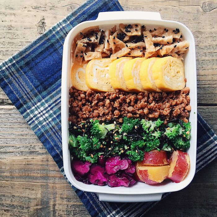 いなり寿司のお揚げさんの余ったのを刻んだもの、鶏そぼろ、ブロッコリーとひじきのナムル、さつまいも煮、しば漬け。