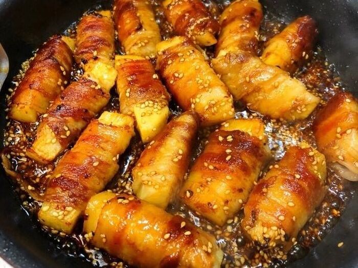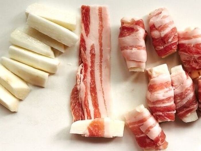 2.豚肉は長さを半分に切り(16枚になる)、長芋を一切れずつ巻く。