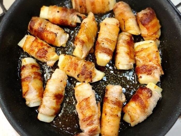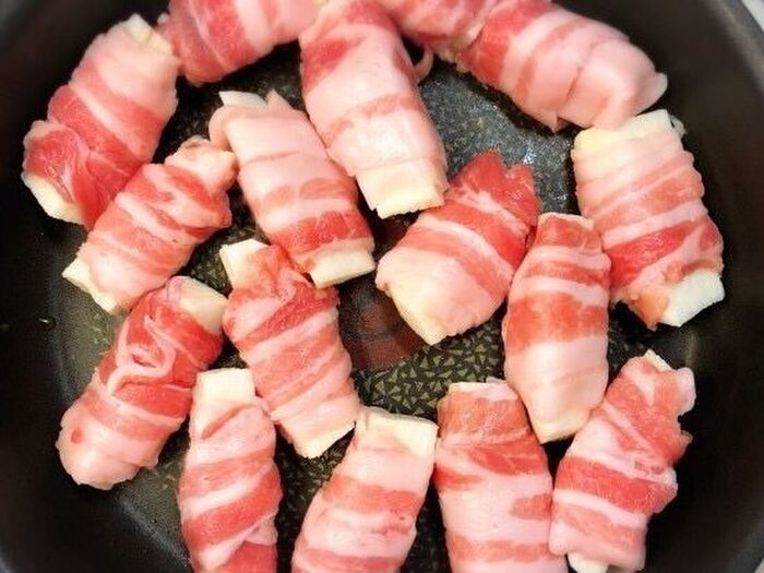 3.(油なしの)フライパンに2を巻き終わりを下にして並べ入れ、中火にかける。たまに転がしながら全体をこんがり焼く。