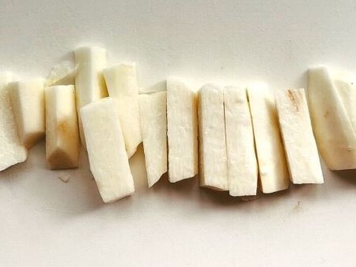長芋は皮を剥いて長さを半分に切り、縦1.5cm角の棒状に切る。(計16本)