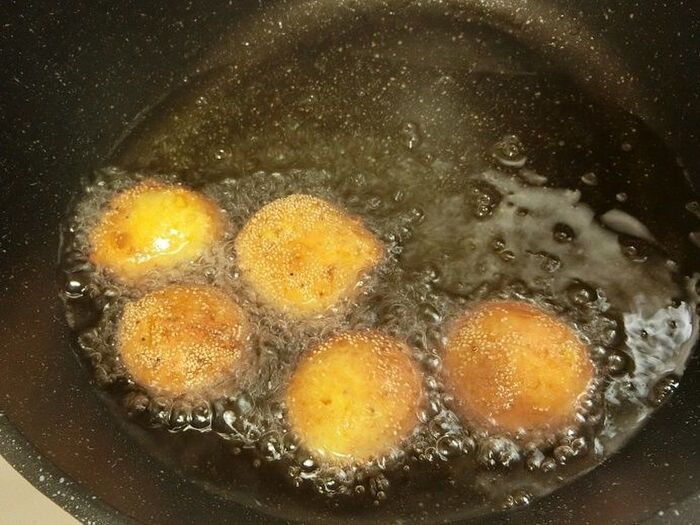 一口サイズに丸めたら、ポピーを全体にまぶします。180℃くらいの油で転がしながら揚げ、きつね色になったら完成♪