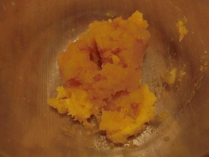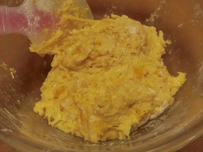 別のボウルでバターと砂糖をよく混ぜ合わせたら、卵、かぼちゃをよく混ぜ合わせます。