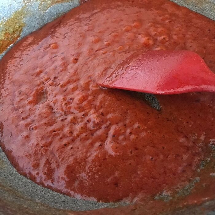 2:1に野菜ジュースを加え中火にし、鍋肌から中心に向かって混ぜながらどんどん煮詰めます。
