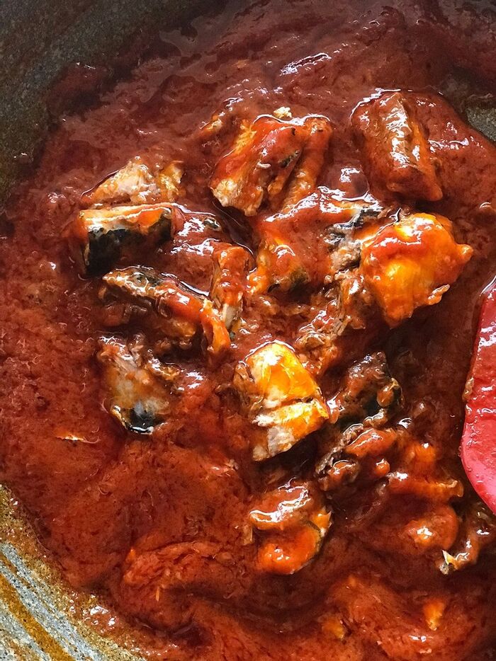 2:野菜トマトソース、いわし水煮、バターをフライパンに入れ中火で熱し、いわしにソースを絡め混ぜ、いわしが中まで温かくなったら、粗びき黒こしょうを振り混ぜ、1のパスタにかける。