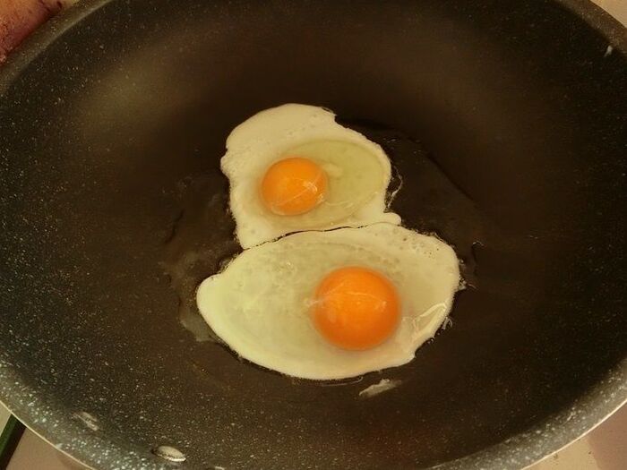 裏面が焼けたらもう一度ひっくり返し、スライスチーズを乗せてフタをします。チーズが溶けたら取り出し、目玉焼きを作ります。