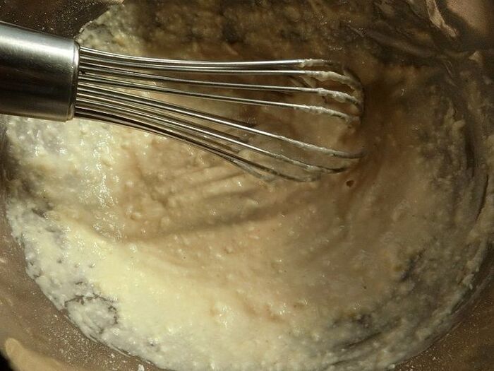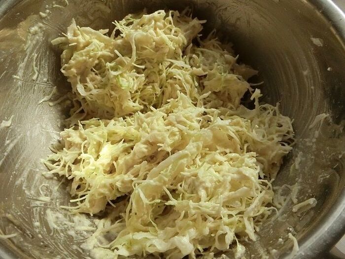 卵、水、お好み焼き粉を混ぜ合わせたら、キャベツを混ぜ合わせます。
