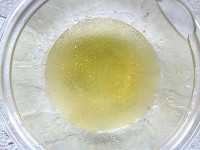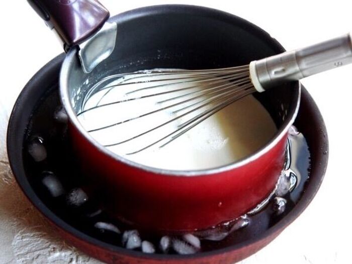 3.鍋底を氷水に当てて混ぜながら冷ます。とろみがついたらグラスに注ぎ、冷蔵庫で4時間以上冷やす。