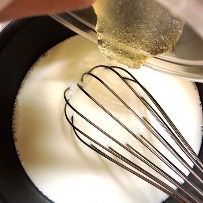 2.小鍋に●を入れて火にかけ、混ぜながら砂糖を溶かす。沸騰直前で火を止め、1を加えて混ぜ溶かす。