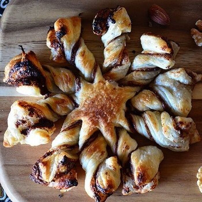 3:パイの中央に小さいカップをのせ、その周りを10~12等分に切り、1つずつ一定方向にねじる。
