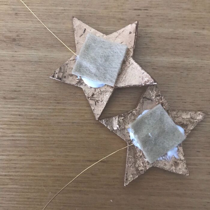 ウッドのお星様はワイヤーをボンドでつけました。ワイヤーはボンドをつける先端を輪っか状にしておくと固定しやすいです。