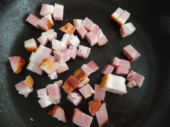 ベーコンは 小さな角切りにしてフライパンで カリッとさせる