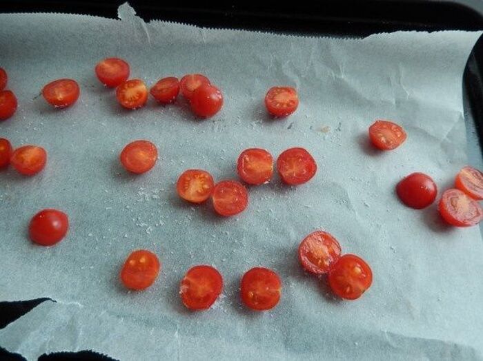 トマトは半分に切り塩をふって180°のオーブンで20分ぐらい焼く
