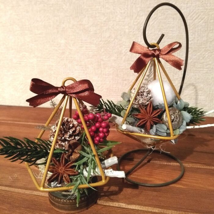 テラリウムオーナメントは上の方は五角垂の形をしているので、上の輪っかの部分の向きを見て、正面になる位置を決めてからアレンジするとよいと思います。