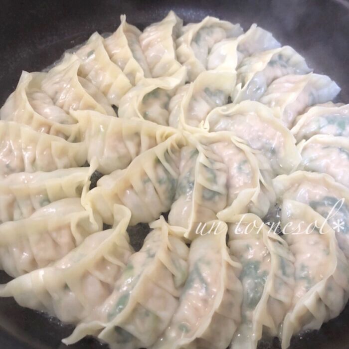 フライパンに並べ、水(分量外 80〜100ml)をいれたフタをして約5分ぐらい蒸し焼きにし、フタを開けてカリッと焼き目がつくまで焼けば完成‼︎《中火》