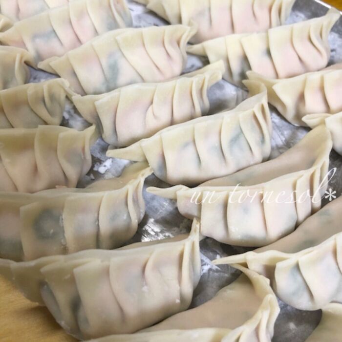②に絹豆腐をよく潰していれ、野沢菜とにんにく・ごま油を加えて全体をよく混ぜ合わせ、ギョウザの皮で包む。