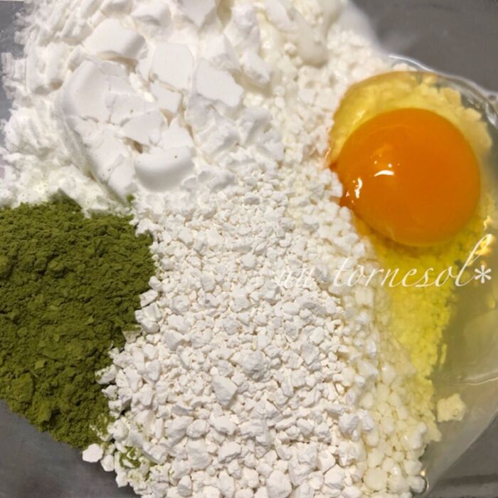 白玉粉と片栗粉・さとう・抹茶・卵・牛乳・サラダ油をよく混ぜ合わせる。