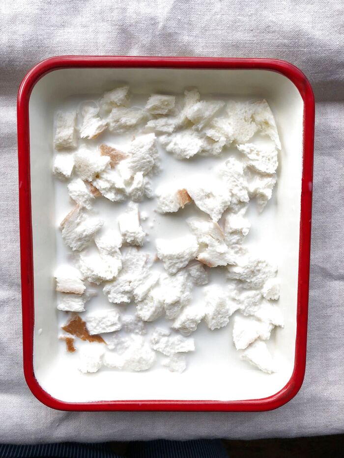1. 食パンは細かくちぎり、牛乳にひたしておく。