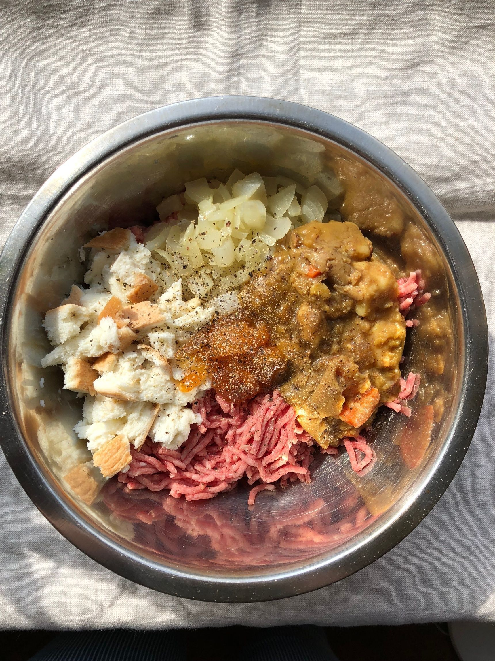 4. ボウルにひき肉、1、2、3と杏ジャムを入れ、こしょう、ウスターソースをかけ、粘り気が出るまでよく混ぜ合わせる。