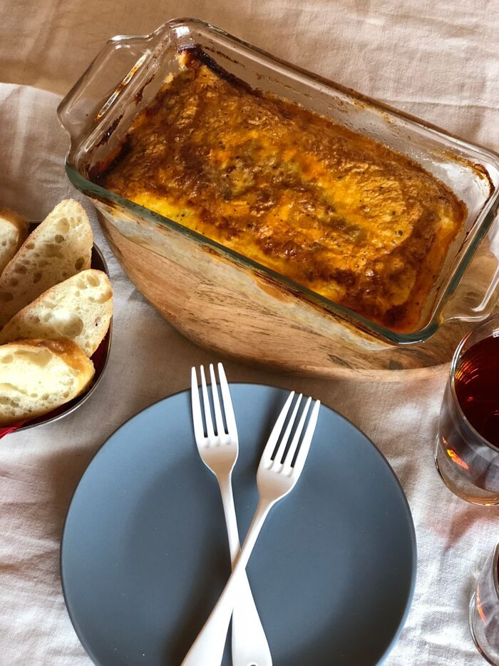 5. 耐熱皿に4を敷き詰め、Aをよく混ぜ合わせたものをかける。