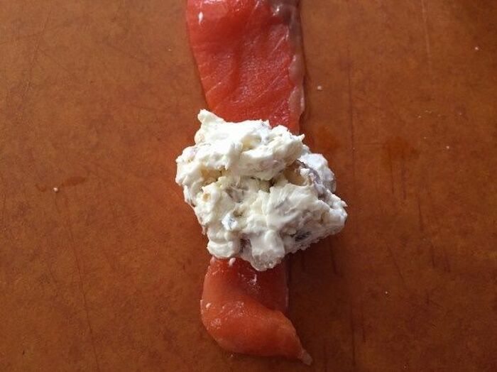 スモークサーモンを広げ クリームチーズをのせくるくるっと巻く