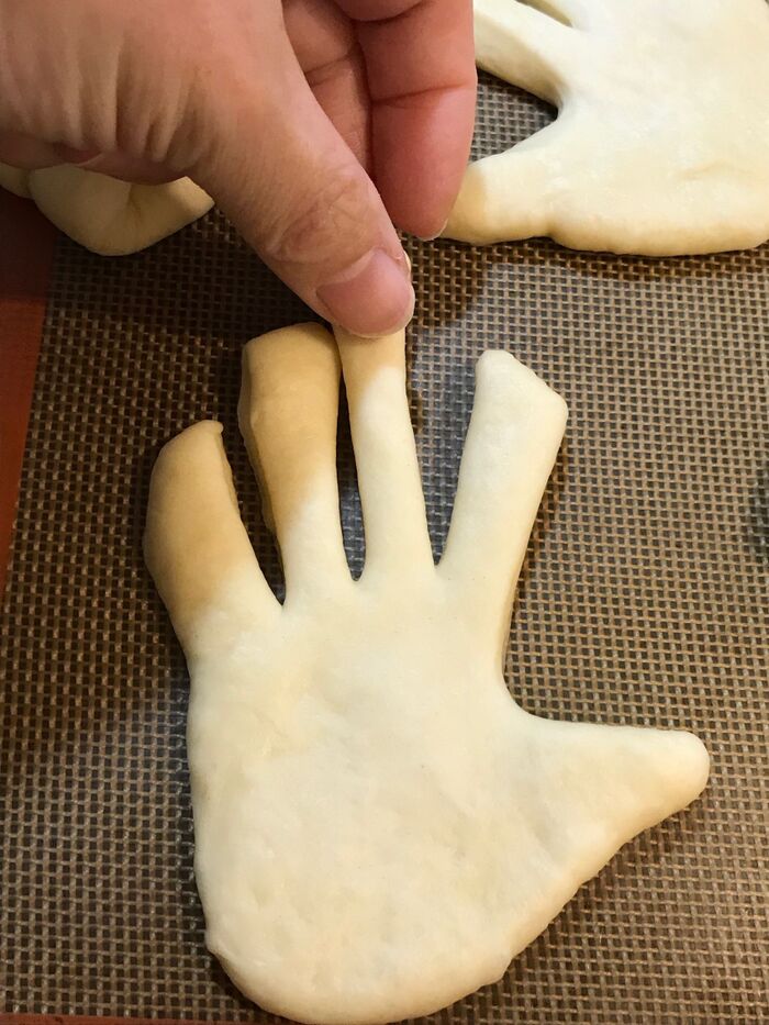 親指と人差し指の間をスケッパーで切り込みを入れ、生地をそっと動かして90度くらいの隙間を開ける
