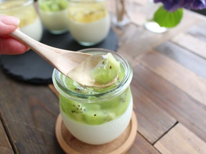 今回はキウイで作りましたが、ゼリー部分にいろんなフルーツを入れると楽しいです!これからの季節、いちごがおすすめ♪ぜひ作ってみてくださいね!