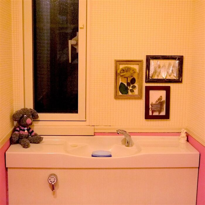 写真は壁紙を挟み、紫色の造花を置いた所。