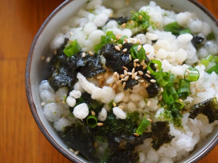 お茶漬けや雑炊といったものがものすご~~~く好きなのですが、悪魔茶漬けは期待を裏切りませんでした!青のりや天かすがいい仕事をしてくれています。ご飯と材料と白だしをテーブルに並べて「はい!各自ど~ぞ!」と、子ども達も自分でやってもらえばいいですね♪