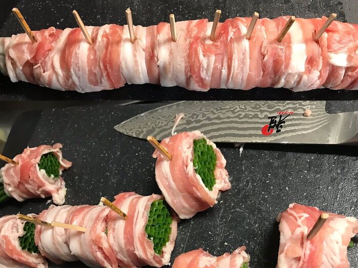 1:豚肉を縦に並べ、こねぎを手前にのせ、くるくると巻き、