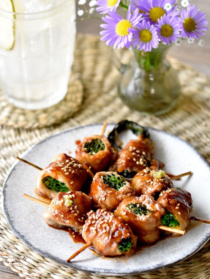 お弁当や、お酒のおつまみには、串に刺したまま盛り付けて。