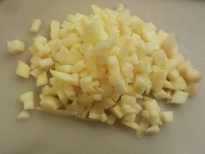 リンゴは1個をすり下ろし、もう1個を1㎝角に細かく切ります。(皮はむきましたが、むかなくてもOK)