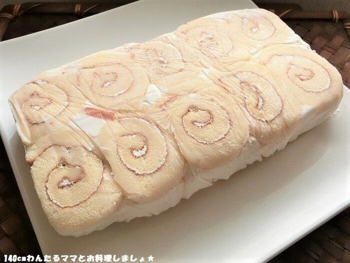 ロールケーキは冷凍庫で1時間ほど固まらせ、厚さを半分に切ります。