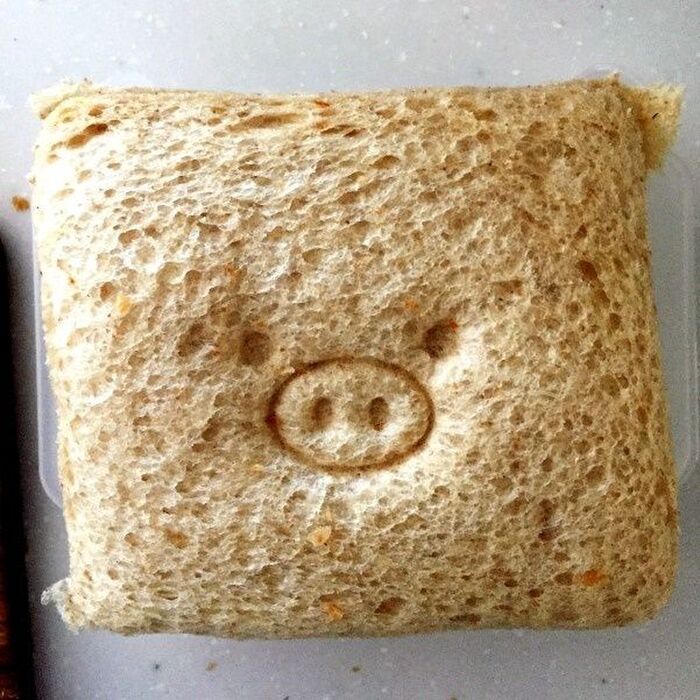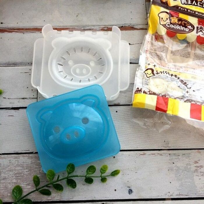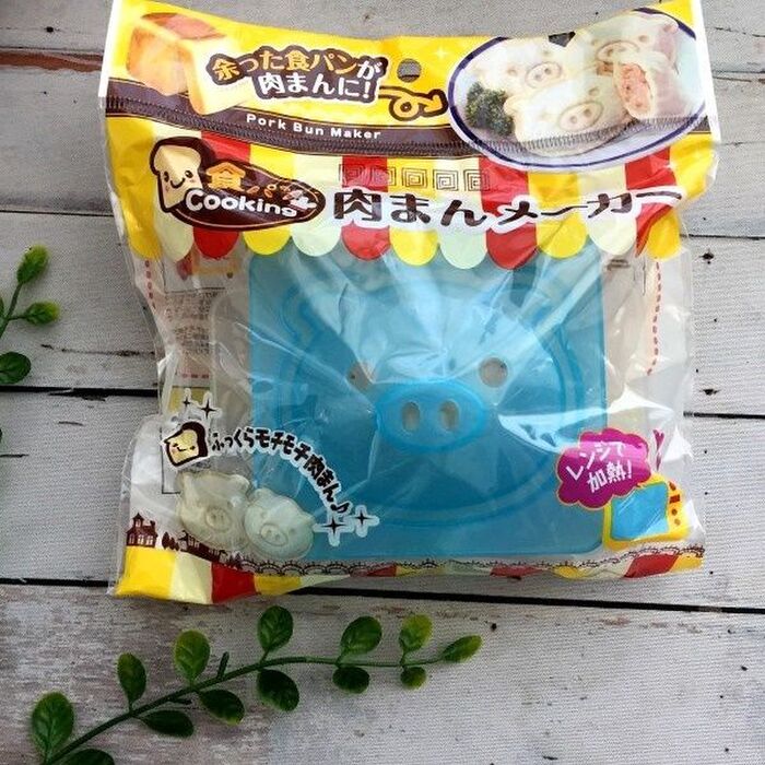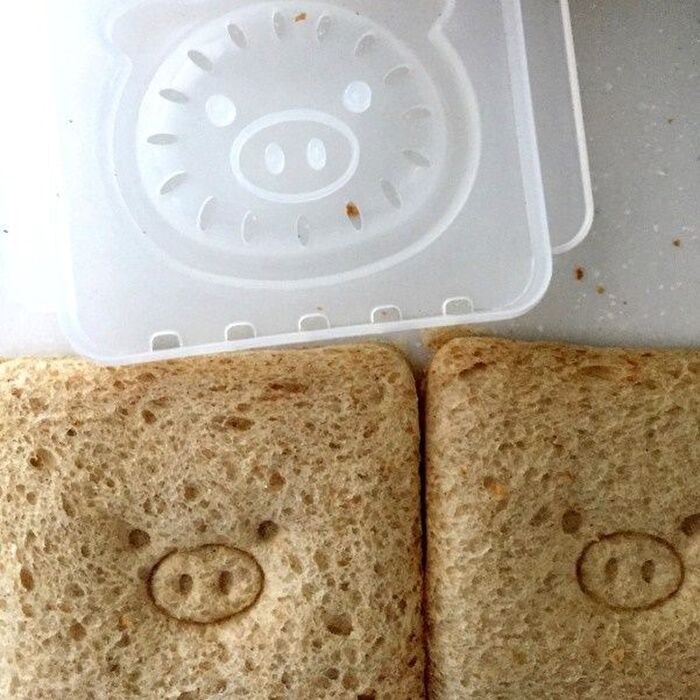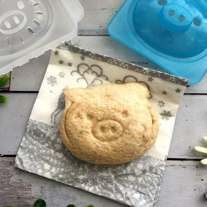 8枚切りの食パン2枚を レンジで加熱して柔らかくして白い型で 豚さんの顔をつけます。