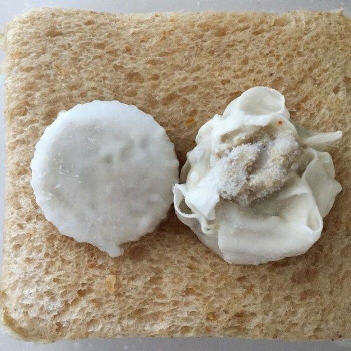 くぼみに 横半分に切った冷凍シュウマイをのせてから もう1枚のパンを重ねます