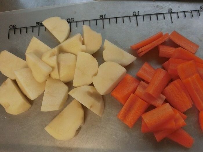 じゃが芋は厚さ1㎝の半月切りに、人参は厚さ5㎜の拍子切りにします。