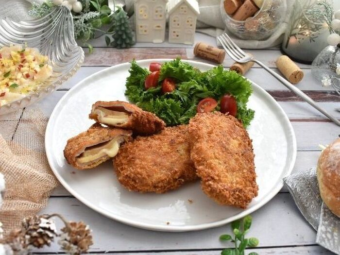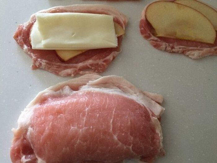 少し厚みのあるお肉に切り込みを入れて チーズとリンゴをはさんでもいいです。