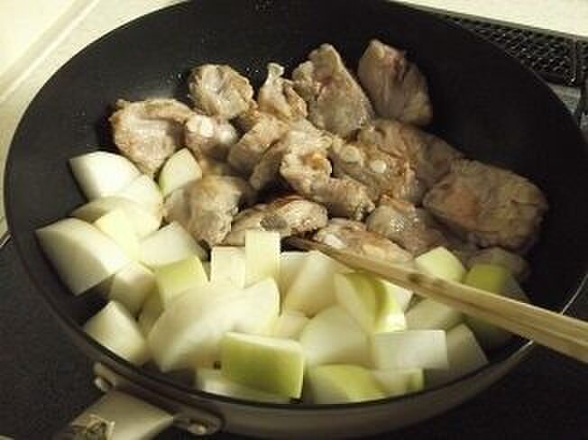1cmのいちょう切りにした大根と豚軟骨をフライパンに入れて