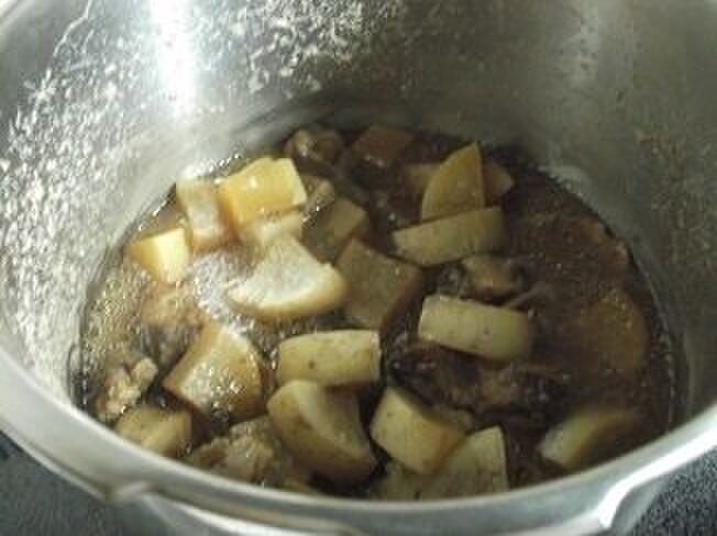 焼き目を付けた豚軟骨、大根の順に入れる。