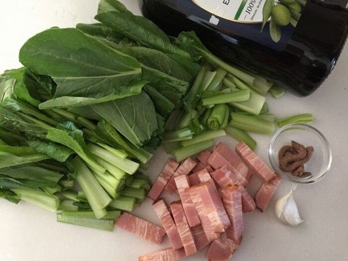 アンチョビを入れて溶かし 小松菜の茎を加え炒める