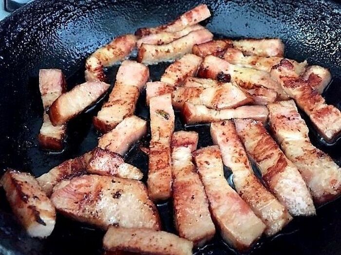 厚切りベーコンを使い ブランデーなどのアルコールをふって