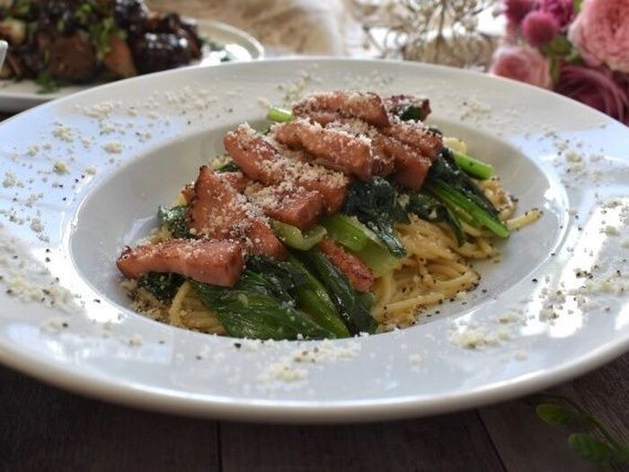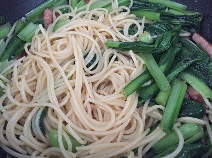 スパゲッティ 小松菜 ベーコンの順で盛り付けてみました。