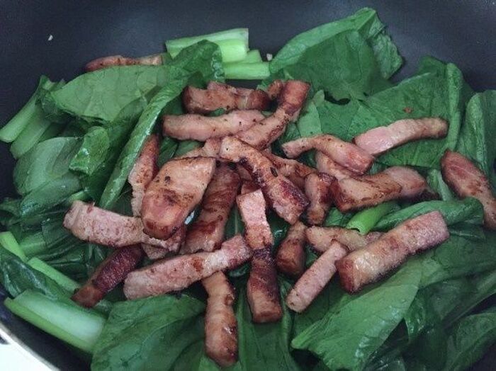 茎と葉っぱの部分を加え炒め 葉っぱの部分 炒めたベーコンを加え