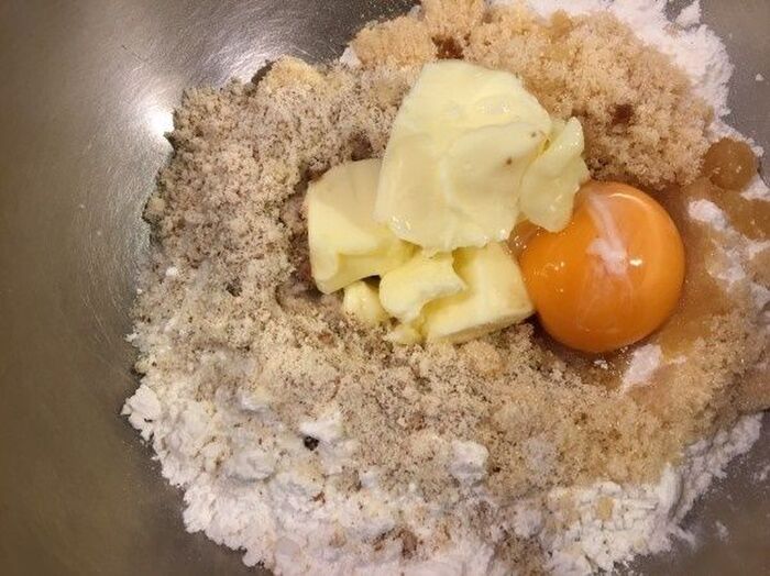 真ん中にくぼみを作り バター 卵黄 水 バニラエッセンスを入れ